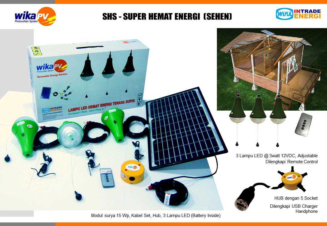 WIKA PV SHS-SEHEN adalah produk lampu penerangan energi surya terbaru untuk rumah pedesaan yang sangat efisien dan harga terjangaku. SHS-SEHEN terdiri dari satu unit modul PV 10 s/d 15 watt (Poly/Monocrystaline) beserta supportnya, satu unit Hub dan kabel set, 3 unit lampu LED (daya 3 watt/lampu) tahan lama dan armaturenya dengan baterai tipe Li-ion internal, serta satu unit USB charger untuk Handphone. Lampu SEHEN ini sangat tepat untuk perumahan penduduk desa yang tersebar dan jauh dari jaringan listrik. Untuk info lebih lanjut dapat hubungi WIKA Hotline 021-8565555 (hunting) pada jam kerja.